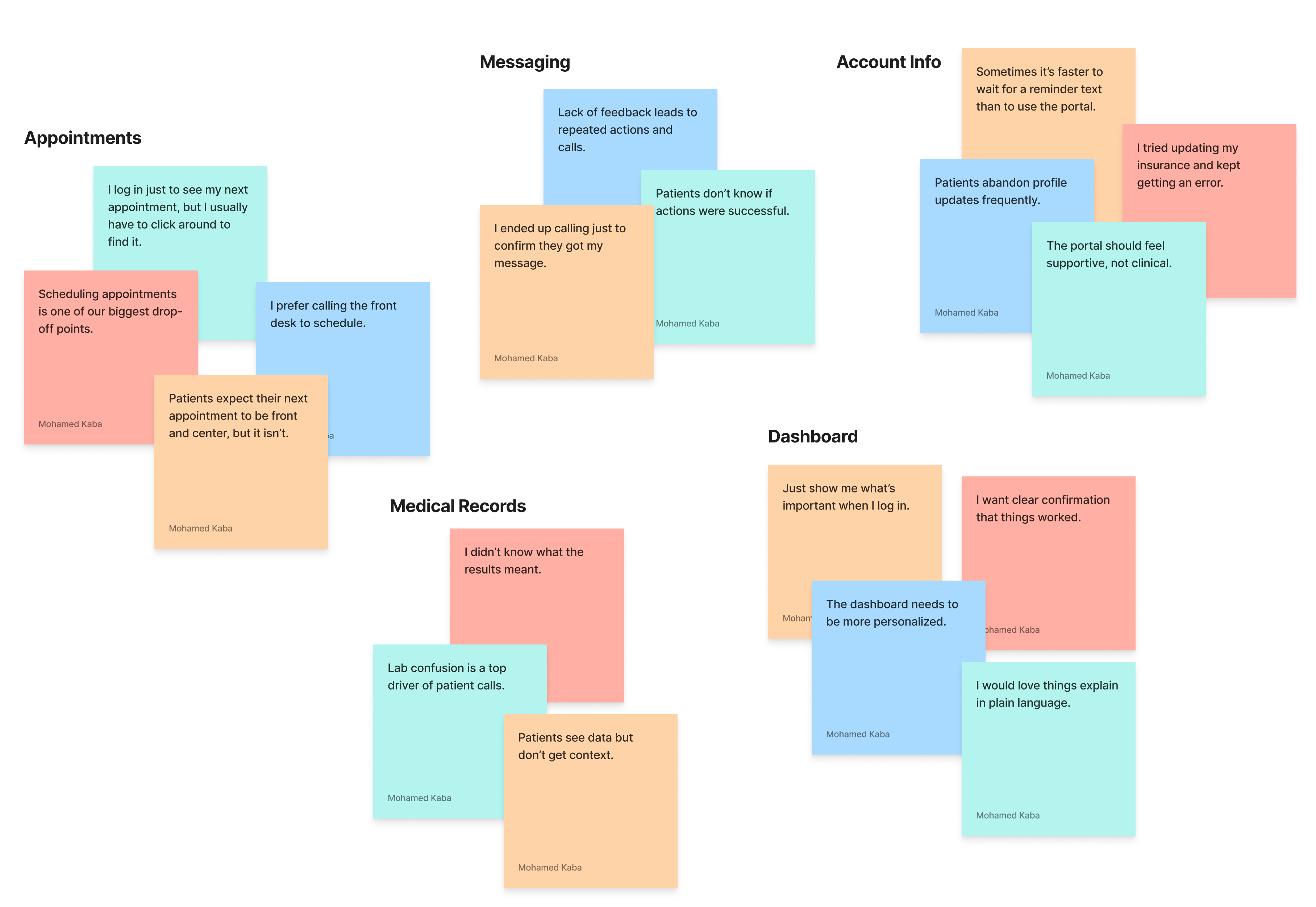 I conducted interviews with 2 stakeholders and 4 patients. The interview questions focused on understanding current usage patterns, and pain points the user encounters while using the web portal. The qualitative data gathered helped us to get an idea of what our users were looking for and to gather as much information from them as possible before moving forward.